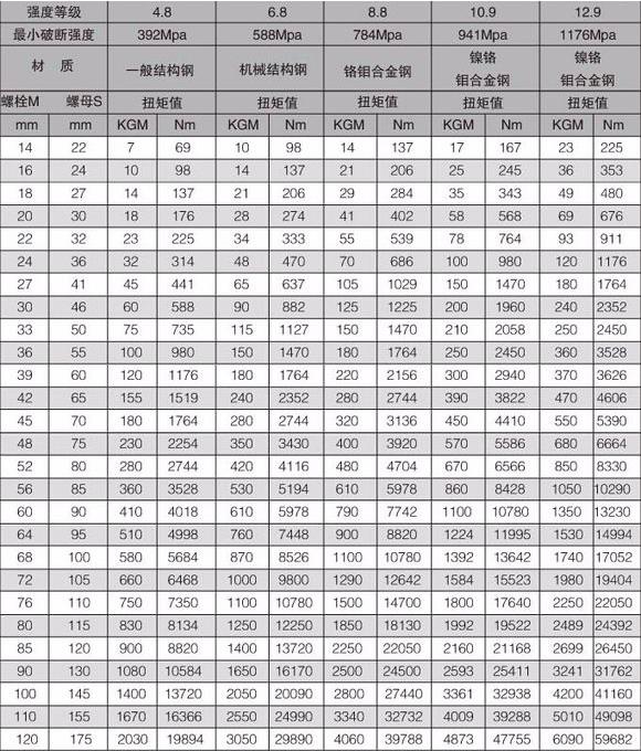 相信許多用戶在選購液壓扭矩扳手之前都看過液壓扳手扭矩對照表,液壓扳手扭矩對照表其實就是螺栓扭矩值推薦表,它主要被用來查詢螺栓螺母的強(qiáng)度等級、材質(zhì)和螺栓大小扭矩值的一張表格,能夠更好的幫助用戶選擇合適的扳手型號,下圖就是液壓扳手扭矩對照表。
